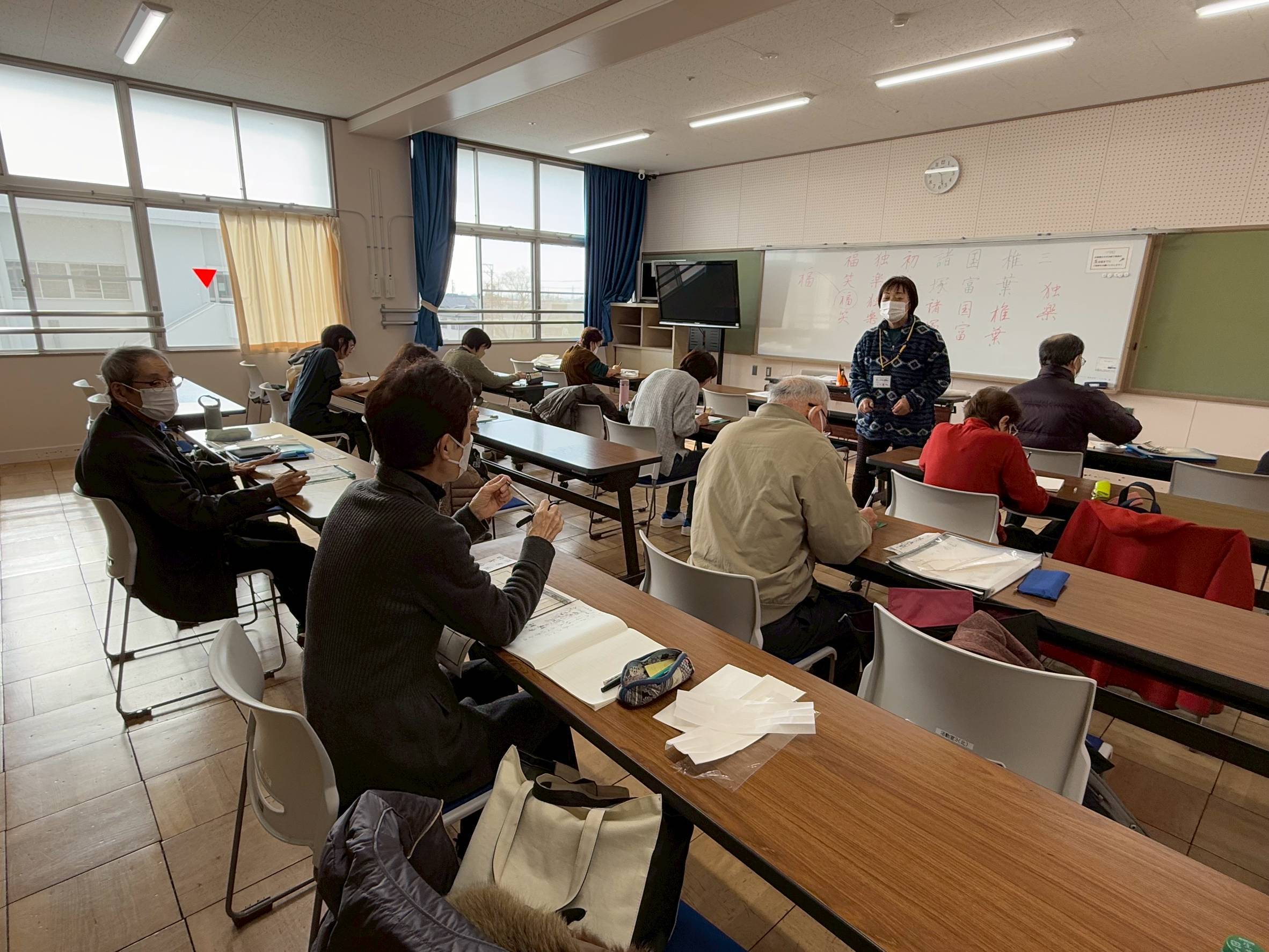 持ち物 筆ペン、下敷、用紙(持っている方)、筆(大、小)、書道道具