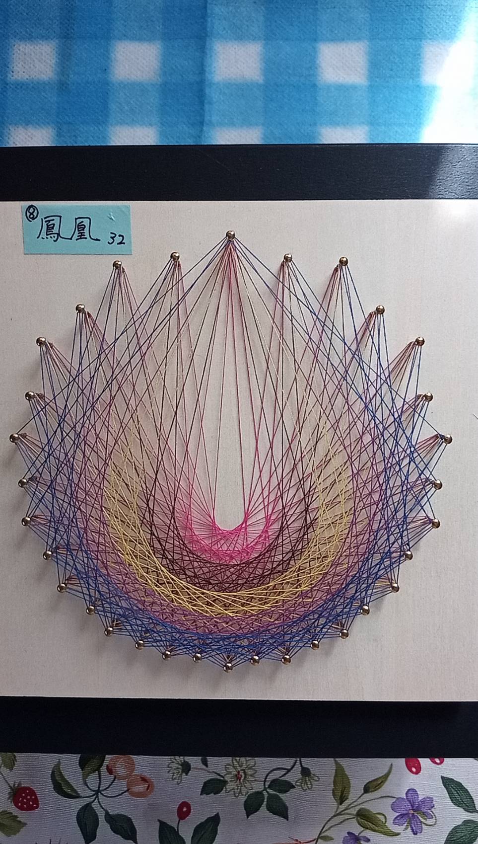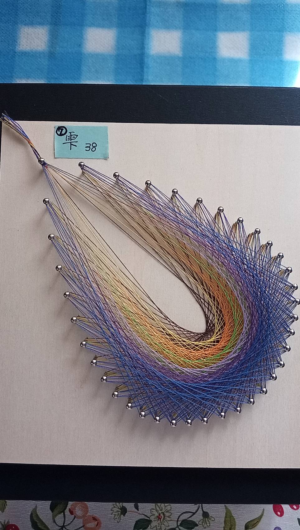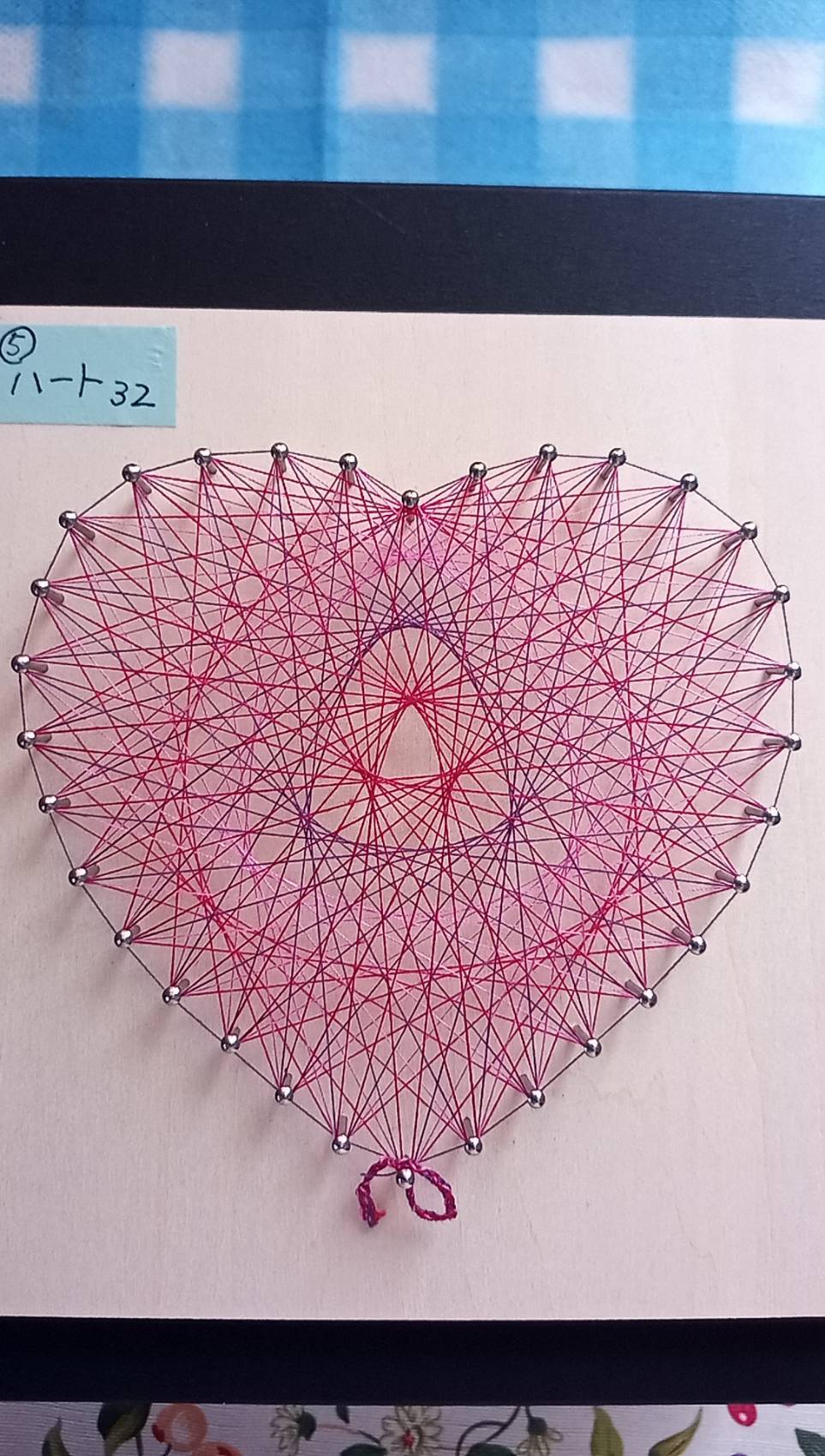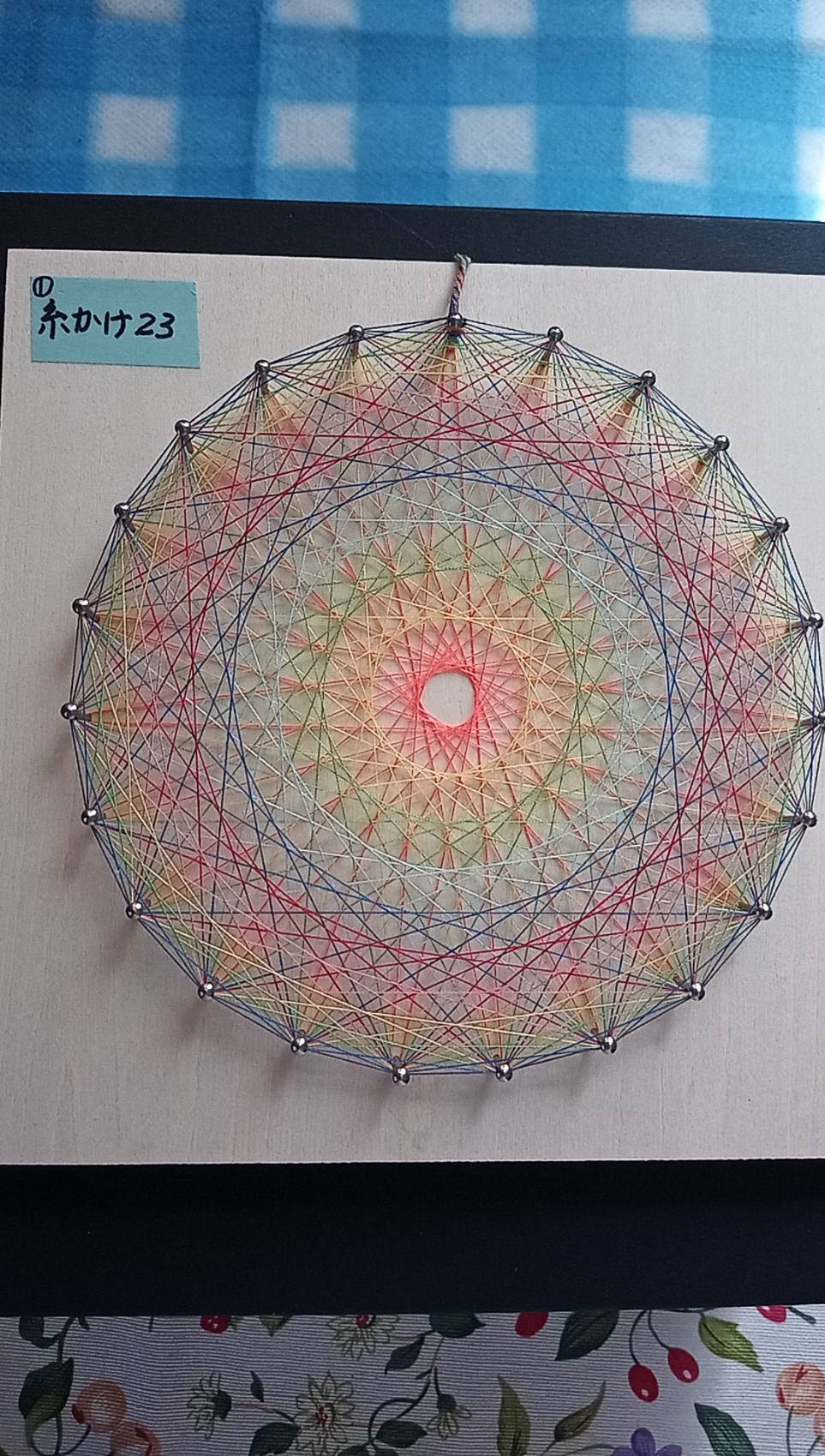 釘打ちした板に規則的に糸をかけてアート作品を作り出します。