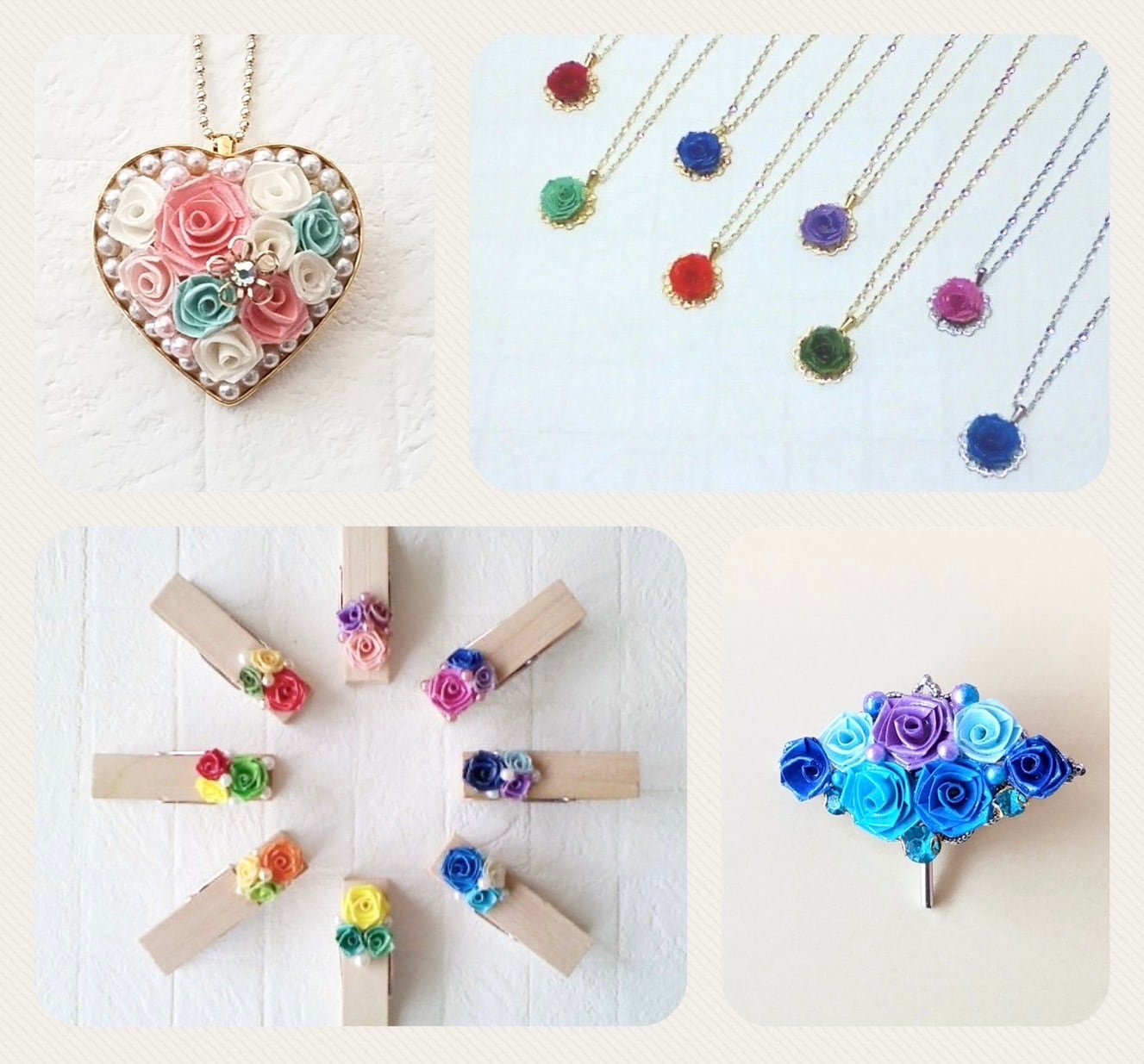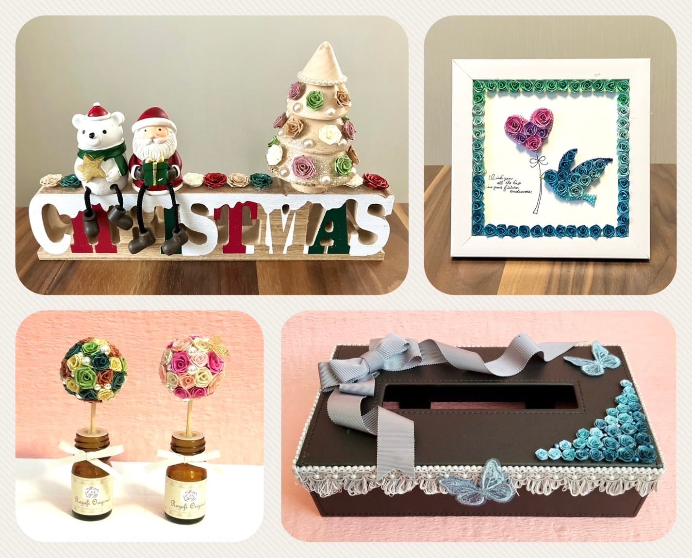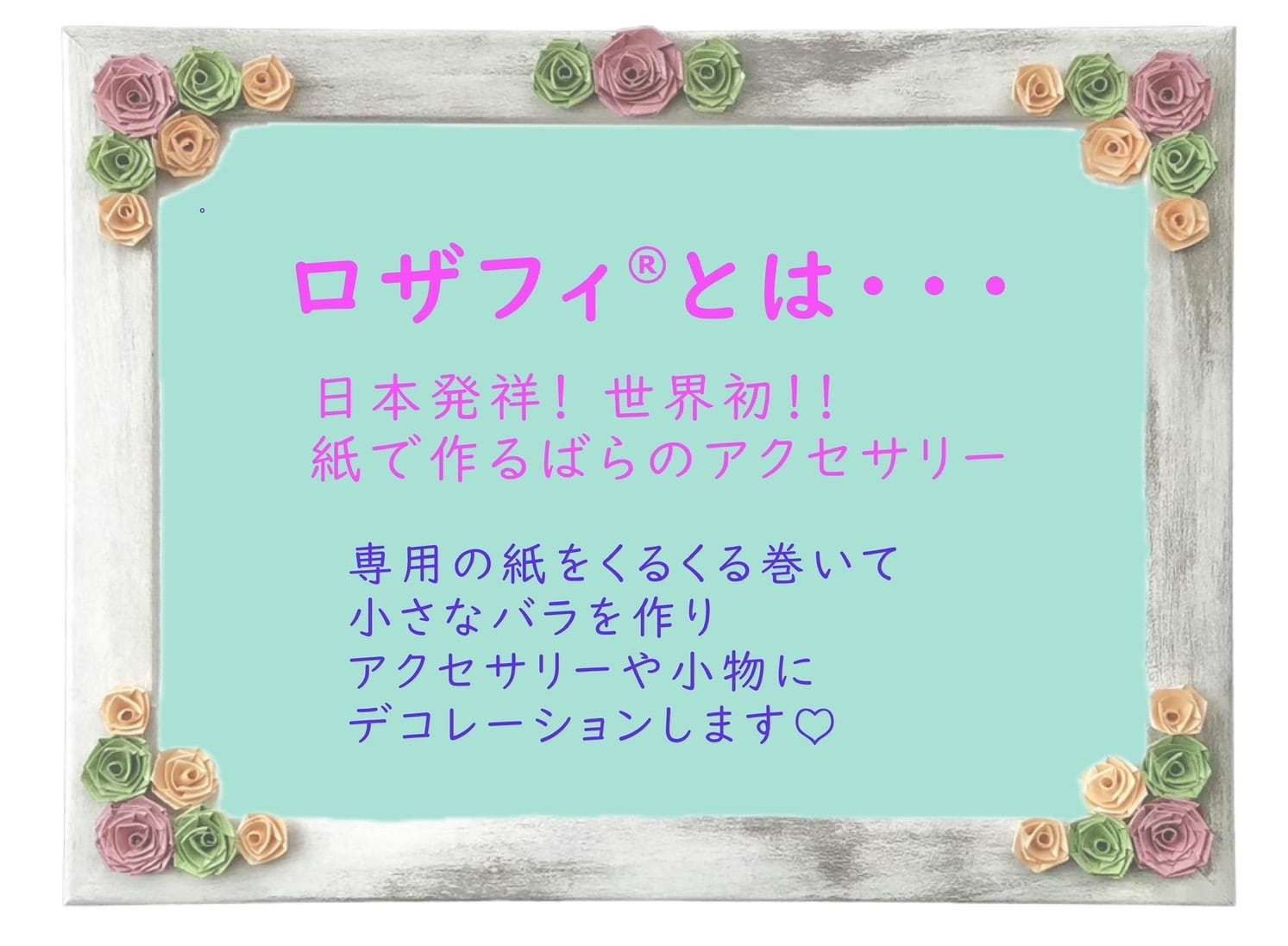 ロザフィ専用紙を巻いて小さなバラを作り、小物にデコレーションして仕上げます。覚えるバラの巻き方は1つだけ!コツを掴んだら、お好きな色のバラで盛り盛りデコレーションしましょう♪